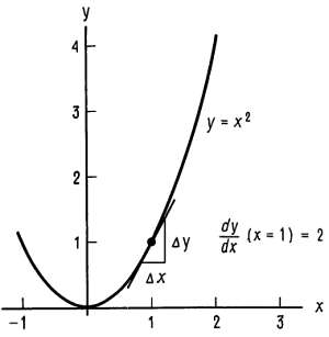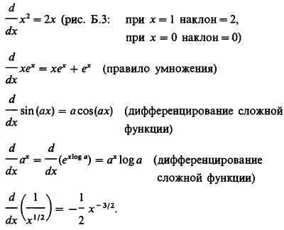 Производная у по х определяется углом наклона графика у к оси х. Если вы проведете касательную к графику функции в некоторой точке, то наклон касательной в этой точке и есть dy/dx, т. е. производная сама по себе представляет функцию, так как ее значение определено в каждой точке. На рис. Б.З наклон в точке (1,1) определяется значением 2, а в точке начала координат он нулевой (немного ниже сказано, как вычисляется производная).