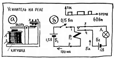 Итак, простейшая задача усиления решена. Что же потребовалось нам для этого? Во-первых, нужно было иметь сам сигнал — его мы получили с помощью батарейки и телеграфного ключа. Нельзя было обойтись и без источника энергии для создания «мощной копии», то есть без автомобильного аккумулятора. А для того, чтобы этот источник давал энергию не в виде постоянного тока, как обычно, а в виде нужных нам точек и тире, понадобилось еще одно, так называемое управляющее устройство — в нашем случае реле. Именно оно замыкало и размыкало цепь аккумулятора, заставляя его копировать точки и тире входного сигнала.