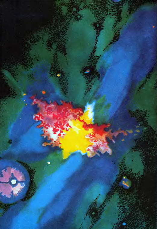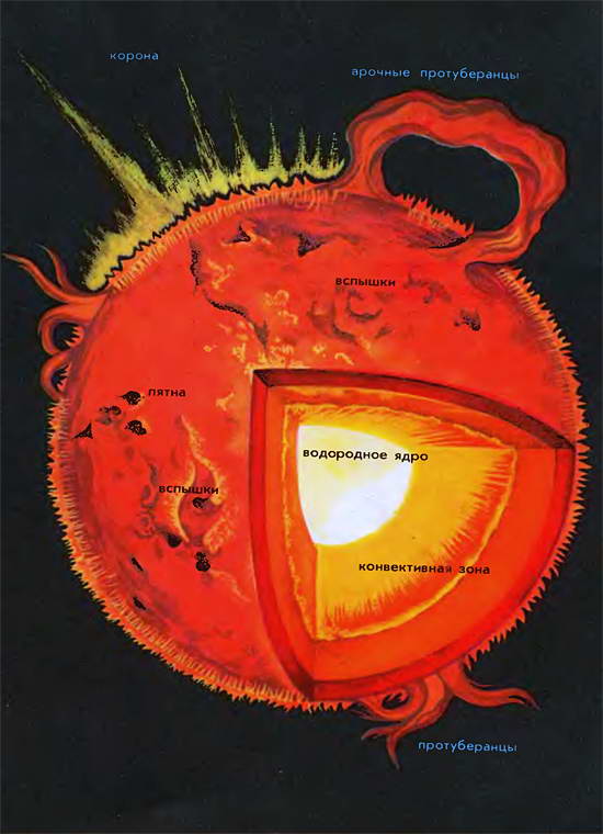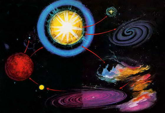 1 — сверхновая, 2 — нейтронная звезда, 3 — черная дыра, 4 — газопылевое облако, 5 — протозвезда, 6 — Солнце, 7 — красный гигант, 8 — белый карлик.