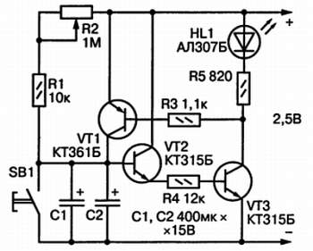 В дежурном состоянии, показанном на схеме, контакты кнопки SB1 разомкнуты, конденсаторы С1 и С2 заряжены, все транзисторы открыты и светодиод HL1 горит. Если нажать и отпустить кнопку, конденсаторы быстро разрядятся, а затем начнут медленно заряжаться через резисторы R1 и R2. Все транзисторы оказываются заперты, и светодиод не горит.