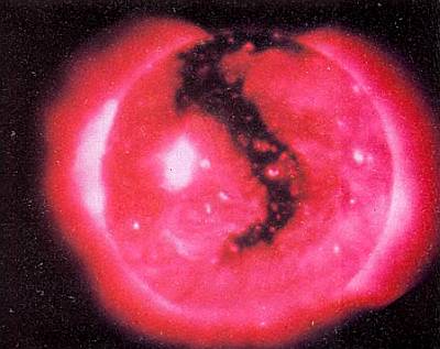 В последнее время благодаря космическим аппаратам и спутникам появилась возможность наблюдать то излучение короны, которое не проходит через земную атмосферу. Поскольку температура короны очень велика, у нее особенно интенсивно рентгеновское излучение. Но вообще излучение в разных местах короны происходит неравномерно. Существуют горячие активные и спокойные области, а также корональные дыры с температурой 600 000°, то есть относительно невысокой. Из этих дыр в пространство выходят магнитные силовые линии. Они не имеют замкнутой формы и не стягивают вещество.