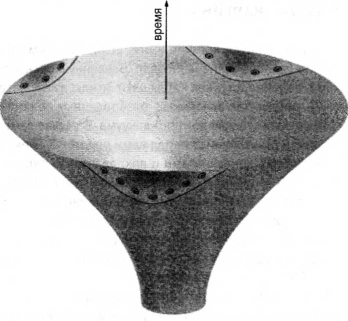 Рис. 10.3. Пространство-время одномерной замкнутой Вселенной с бесконечной инфляцией. Эта Вселенная заполнена ложным вакуумом в начальный момент времени (внизу рисунка) и содержит три островных вселенных к моменту, соответствующему верхнему краю диаграммы.