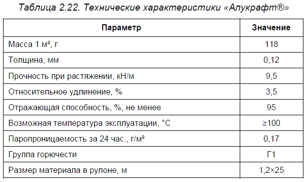 В строительстве бань и саун «Алукрафт®» является оптимальным пароизоляционным покрытием стен. Его использование значительно сокращает потери пара и тепла и предотвращает появление сырости в стеновых конструкциях при периодических изменениях температуры и влажности внутри помещения. «Алукрафт®» выдерживает эксплуатацию при температуре свыше 100 °C и позволяет экономить тепло за счет хорошей отражающей способности. [27] Основные характеристики материала даны в табл. 2.22.