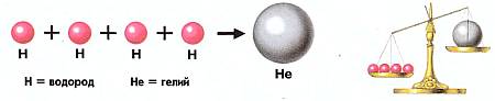 Из четырех водородных ядер в недрах Солнца образуется одно ядро гелия. Масса этого ядра меньше, чем сумма масс его составляющих. Недостающая масса преобразуется в энергию.