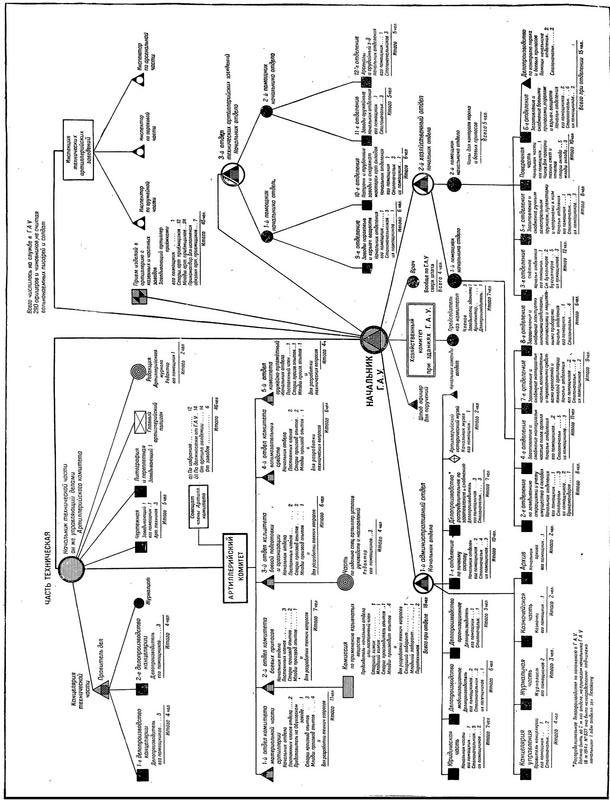 В конце мая 1915 г. начальником ГАУ был назначен генерал Маниковский, отличавшийся исключительной энергией и лично известный верховному главнокомандующему. При Маниковском колоссальные требования армии предметов артиллерийского снабжения все более и более осложняли работу ГАУ. По мере увеличения новых требований видоизменялась организация ГАУ, штаты его непрерывно расширялись. К маю 1917 г., когда Маниковского, назначенного помощником военного министра, заменил генерал Лехович, ГАУ представляло чрезвычайно сложный и громоздкий организм. Состав его увеличился втрое: в феврале 1915 г. в ГАУ служило всего 290 офицеров и чиновников, в том числе было 12 прикомандированных, а в мае 1917 г. — 980 (см. схемы 1 и 2), в том числе около 500 человек прикомандированных и по вольному найму, не считая вольнонаемных писарей и солдат. Сверх того в химическом комитете, организованном при ГАУ, работало с мая 1917 г. около 300 человек, из них большинство специалистов инженеров и техников.