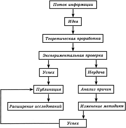 Рис. 29. Примерный алгоритм научного исследования. Правая часть цепочки (горестный путь от одной неудачи к другой) может повторяться бесконечно. Левая же часть по интенсивности вызываемых ею ощущений сравнима только со звоном монет в игральном автомате