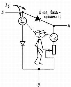 Подзаголовком этого приложения могут стать такие слова: «Диод база-коллектор одерживает победу над транзистором». На простой модели транзистора, в образе которого выступает человек, можно убедиться в наличии конечного напряжения насыщения, которым обладает биполярный транзистор. Основная идея состоит в том, что переход коллектор — база представляет собой большой диод с высоким значением I0 (уравнение Эберса-Молла), значит, в открытом состоянии напряжение на нем при заданном значении тока ниже, чем на диоде база-эмиттер. Следовательно, при небольших значениях напряжения между коллектором и эмиттером (обычно 0,25 В и ниже) некоторую часть базового тока «забирает» диод коллектор-база (рис. Ж.1).