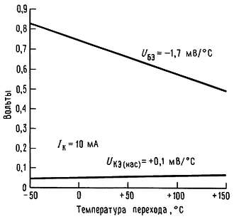 Коллекторное напряжение насыщения UK (нас.) при определенном значении базового и коллекторного тока является величиной, почти не зависящей от температуры, так как температурные коэффициенты двух диодов взаимно компенсируют друг друга (рис. Ж.З). Это свойство представляет интерес, так как насыщенный транзистор часто используют для переключения больших токов и он может нагреваться (например, ток 10 А при напряжении насыщения 0,5 В дает мощность 5 Вт, которой вполне достаточно для того, чтобы переход небольшого мощного транзистора нагревался до температуры 100 °C или выше).