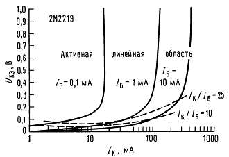 Результаты измерений, представленные на рис. Ж.4, показывают, что трудно точно установить, когда транзистор насыщен; можно использовать, например, такой критерий: IК = 10·IБ.