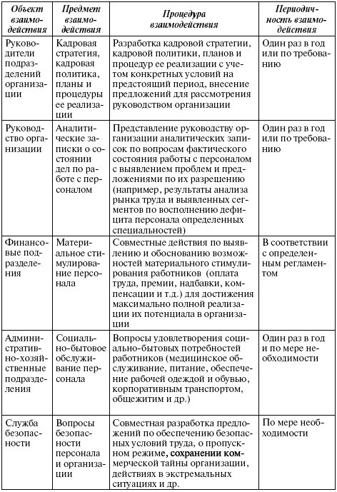 Эффективность деятельности службы персонала в значительной степени зависит от успешности ее контактирования с другими отделами и подразделениями хозяйствующего субъекта. Характер и периодичность взаимодействия могут быть разными в различных организациях. Сценарий взаимодействия должен быть определен, в соответствующем порядке согласован и утвержден (табл. 9.4).