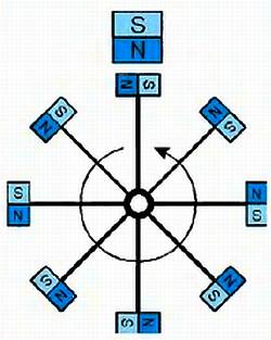 Изобретено много «вечных» двигателей. Я придумал еще один. Однако не могу понять, почему он не будет работать. Конструкция его такова: На спинах горизонтально расположенного колеса установлены магниты (см. рис.), напротив колеса установлен большой магнит, обращенный к колесу (плюсом в моем случае). Следовательно, по моему предположению, первая половина колеса, на которой магниты обращены минусом к большому, должна притягиваться к колесу, а вторая отталкиваться. Что же помешает этой конструкции вращаться вечно?