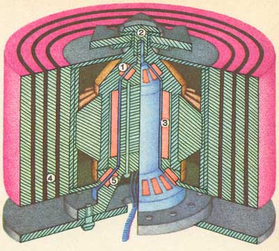 Супермаховичный накопитель Поста: 1 - магнитная подвеска; 2 - подшипник; 3 - электродвигатель-генератор; 4 - супермаховик из отдельных колец; 5 - магнитный подпятник.