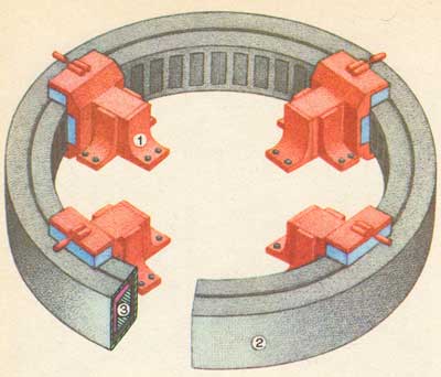 Наш супермаховик-кольцо можно представить в виде как бы непрерывной кольцевой сцепки из таких «вагончиков», только гораздо меньших и состоящих почти из одних магнитов. Крутиться это «гибкое» кольцо будет в вакуумированной трубе, уложенной вокруг электростанции, завода или даже города. Если радиус кольца достигает, например, 16 километров (приблизительно столько же у кольцевой автострады вокруг Москвы), то с применением упомянутых постоянных магнитов скорость кольца-супермаховика составит 4 километра в секунду!