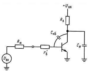 Эффекты, связанные с конечной величиной нагрузочного сопротивления, можно учесть, если считать, что RK представляет собой суммарное сопротивление при соответствующем пересчете UKK. Емкость между коллектором и эмиттером входит в Сн, а Сбэ не учитывается, поскольку благодаря эффекту Миллера Скб всегда доминирует на входе.
