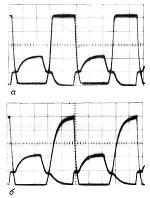 Рис. 13.52. Импульсы переключения напряжений затвора и стока. а — сопротивление стока 10 кОм; б — сопротивление стока 200 кОм. Видно, как с источником, имеющим преувеличенное сопротивление 100 кОм, динамический эффект Миллера способствует фиксации уровня. Цена деления по вертикали 2 В/дел.; частота сигнала 6 кГц.