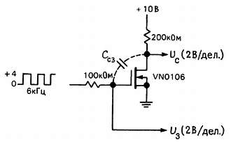 Заметьте, как емкость обратной связи поддерживает напряжение затвора на уровне порога отпирания во время переключения стока. Обратите внимание также на то, что нарастание сигнала стока изменяется экспоненциально, если Rc велико.