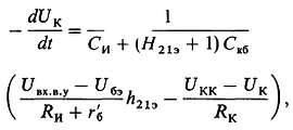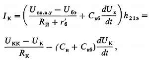 где первое выражение — это ток базы, умноженной на h21э, а второе — ток коллектора, определяемый как ток через RK минус ток, отбираемый зарядом емкости, подключенной к коллектору.