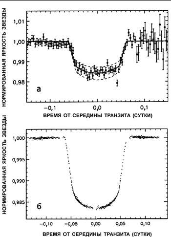 Первые наблюдения транзитов планеты HD 209458 b, выполненные в 2000 году наземными средствами (а) и с орбитальной обсерватории HST (б).