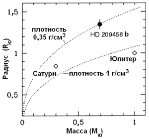 Звезды, имеющие планеты типа "горячий юпитер", составляют незначительную часть всего звездного "населения" – только 0,0075. Учитывая также произвольное положение плоскости их орбит, вероятность встретить среди звезд солнечного типа объект с наблюдаемыми транзитами еще меньше и не превышает 1/1300. На рисунке внизу показана зависимость масса-радиус для экзопланеты HD 209458 b, Юпитера и Сатурна. Положение HD 209458 b сразу указывает на водород как основную составляющую этого небесного тела (возможно, с небольшой долей гелия). Температура внешних оболочек "горячих юпитеров", в зависимости от орбиты и свойств атмосферы, лежит в пределах 900-1300 К. Облачный слой в такой атмосфере должен состоять из мельчайших зерен MgSiO3, Fe и Al2O3, причем в надоблачной атмосфере должны присутствовать пары воды, метана и окиси титана.