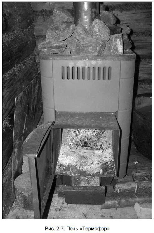 Установленная у меня печь рассчитана на объем парильного помещения от 8 до 20 м3. Для деревенской бани особенно важна малая масса печи — чтобы ее могли перенести один-два человека без привлечения специальной техники. Среди многих изученных мной вариантов — как печи промышленного изготовления с высокоэффективным нагревом типа «Булерьян», так и предложения местных деревенских кустарей, пропагандирующих «вечные» печи с толщиной стенок до 5 мм. В результате я сделал ставку на печь «Термофор компакт», купленную в Санкт-Петербурге по цене 7500 руб. (рис. 2.7).