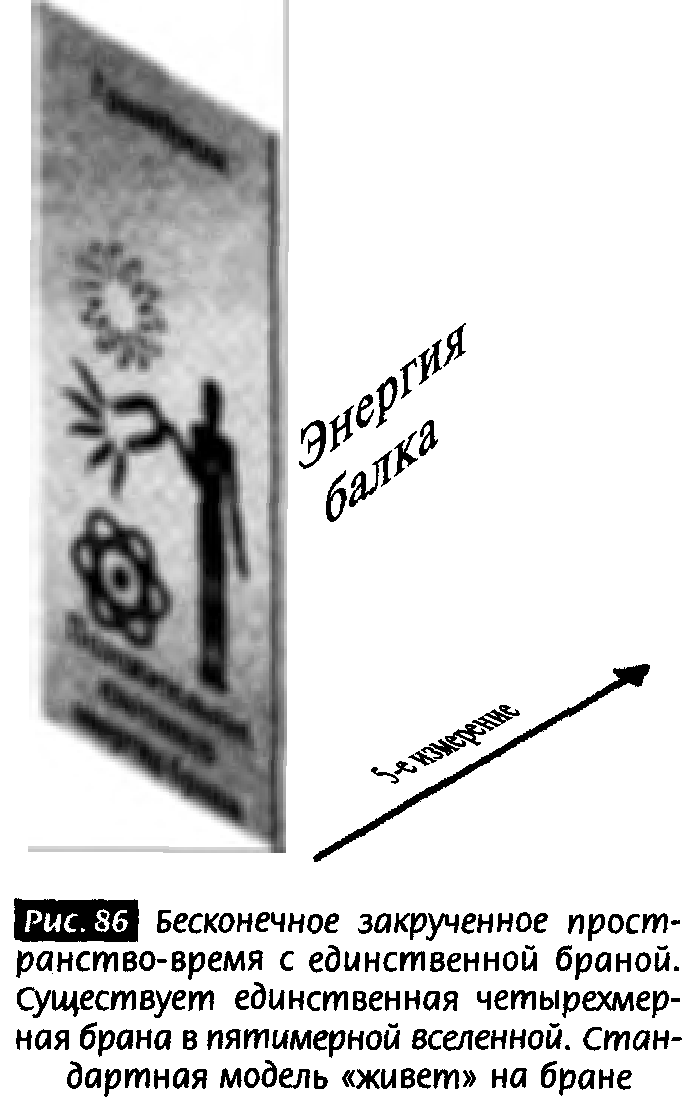 В нашей модели единственная брана находится на одном конце пятого пространственно-временного измерения. Она отражающая, как и две браны, описанные мной в гл. 20. Предметы, которые ударяются о брану, просто отскакивают назад, так что не происходит потери энергии. Так как модель, которую мы сейчас рассматриваем, содержит только одну эту брану, мы предположим, что частицы Стандартной модели удерживаются на ней; обратим внимание на отличие от модели, обсуждавшейся в предыдущей главе, где частицы Стандартной модели были на Слабой бране, которой теперь больше не существует. Местонахождение частиц Стандартной модели не имеет отношения к геометрии пространства-времени, но оно, конечно, имеет следствия для физики частиц.