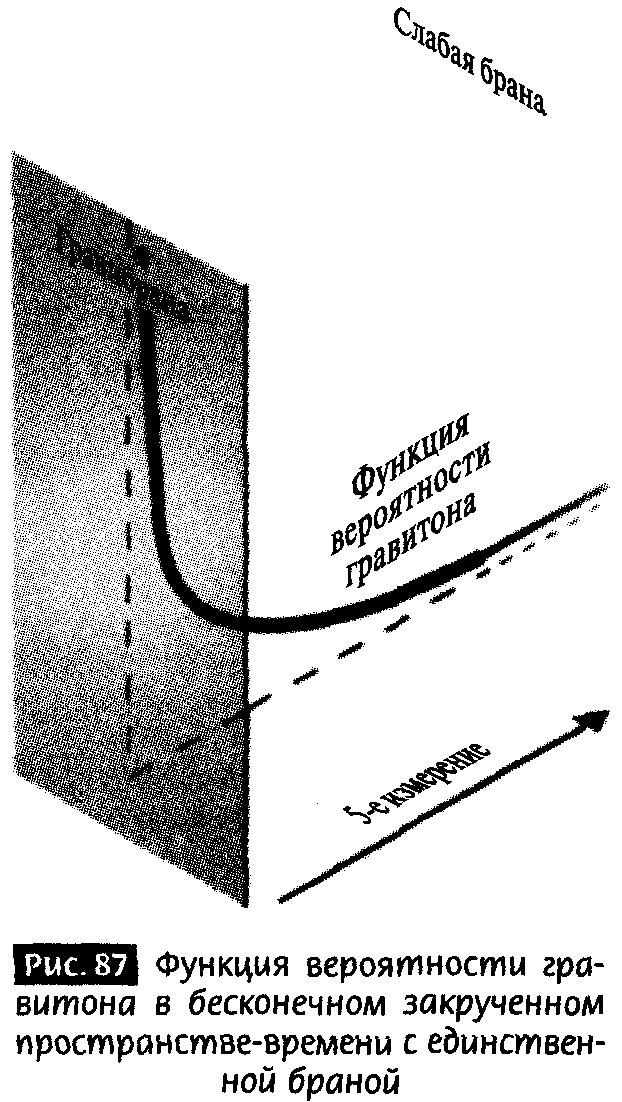 Аналогично, функция вероятности гравитона в нашей закрученной геометрии всегда очень велика вблизи Гравитационной браны, несмотря на бесконечное пятое измерение. Как и в предыдущей главе, функция вероятности гравитона имеет максимум на этой бране (рис. 87), и экспоненциально падает, когда гравитон движется от гравитационной браны в пятое измерение. Однако в этой теории функция вероятности гравитона продолжается бесконечно далеко, но она несопоставима с величиной функции вероятности гравитона вблизи браны.