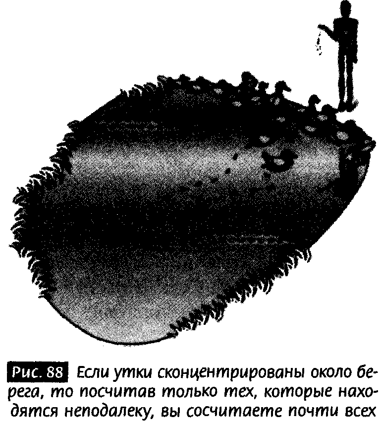 Так как я хочу в следующей главе опять использовать аналогию с утками, я поясню то же самое с помощью подсчета уток, приплывших к берегу, когда кто-то бросает им куски хлеба. Если вы сначала сосчитаете ближайших уток, затем тех, которые подальше, продолжать подсчет скоро станет почти бесполезно. К моменту, когда вы охватите взглядом акваторию чуть дальше вглубь озера, останется очень мало уток, избежавших подсчета. Вам не нужно продолжать считать уток вдали от берега, так как вы уже сосчитали практически всех, ограничившись областью вблизи берега (рис. 88).