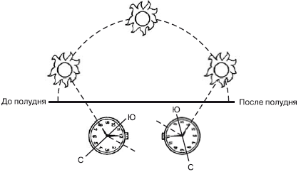 Рис. 6.21. Ориентирование по солнцу и часам (для зимней половины года)