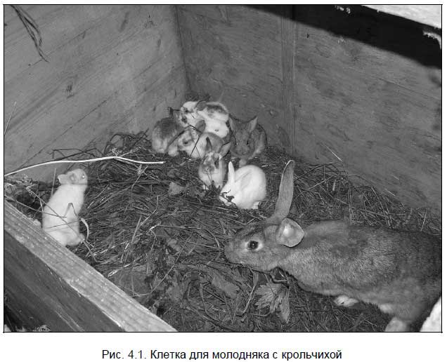 Кролики по своей природе зверьки стадные, поэтому в их стаде устанавливается строгий иерархический порядок подчинения во главе с лидером — самым сильным и активным кроликом. Они, как и многие животные, стойко охраняют свою территорию. Мои попытки подсадить в уже установившееся кроличье общество новых питомцев или соединить две группы (даже недавно родившихся молодых крольчат) не приносят успеха. Поэтому рекомендую создавать большие клетки — вольеры для постоянных кроличьих семейств не только во время выращивания молодняка, но и для постоянной жизни. На рис. 4.1 представлена одна из просторных кроличьих клеток моего хозяйства, в которой крольчиха выращивает крольчат до двухмесячного возраста последних.
