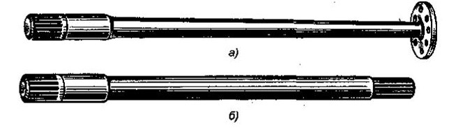 Полуоси, в зависимости от конструкции внешней опоры, определяющей степень их нагруженности изгибающими моментами, бывают двух типов – полуразгруженные и разгруженные. По конструкции полуоси могут иметь на одном конце фланец для крепления болтами к ступице колеса, а на другом шлицевую часть, входящую в зацепление с полуосевым зубчатым колесом дифференциала. Другая конструкция предусматривает шлицевую часть на обоих концах полуоси.