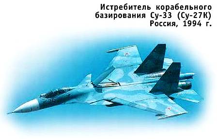 Су-33 — первый отечественный корабельный истребитель горизонтального взлета и посадки и единственный самолет такого типа, стоящий на вооружении ВМФ России. Создан на базе многоцелевого истребителя Су-27. Государственные испытания самолета были завершены в октябре 1994 г., и он был принят на вооружение. Сейчас Су-33 может считаться лучшим в мире серийным истребителем в своем классе.