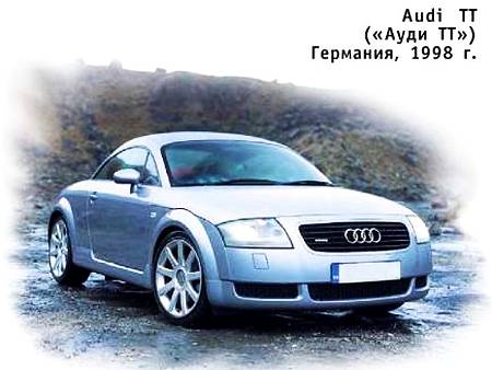 Автомобиль выпущен немецкой компанией Audi, основанной в 1909 г. Августом Хорьхом (помните — герой известного фильма Штирлиц ездил на «Хорьхе»?) и входящей ныне в концерн «Фольксваген». «Ауди ТТ» была создана на основе Volkswagen Golf IV. Машина спортивная, скоростная. Она комплектуется двигателями с турбонаддувом мощностью 180 или 225 л.с. и способна разгоняться с места до скорости 100 км/ч за 6,4 или 3,0 с. Аббревиатура «ТТ» выбрана в честь ежегодной гонки — Tourist Trophy, которая с 1905 г. проводится на острове Мэн в Великобритании.