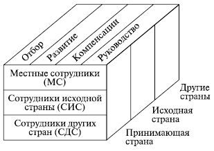 С учетом трехмерной модели интернациональный менеджмент персонала можно определить как направление активизации человеческих ресурсов в организации посредством традиционных функций (отбора, развития и использования сотрудников), реализуемых с учетом категории страны и группы занятого персонала. Основное отличие интернационального менеджмента персонала от национально ориентированного состоит в комплексном подходе, предполагающем осуществление профильной деятельности в разных странах и с носителями различной национальности.