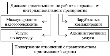 Расширение диапазона деятельности. Деятельность в интернациональной среде предполагает регулирование относительно новых сфер, принятие во внимание которых на национальном уровне не вызывает необходимости (рис. 8.5): международное налогообложение, зарубежные командировки, административные услуги, поддерживание отношений с правительством принимающей страны, услуги по переводу.