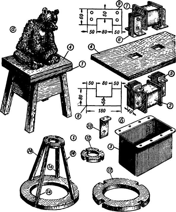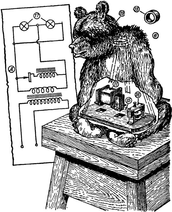 Рис. 62. Внешний вид стола и его части: 7 — электрический стол; 2 — половина трансформатора с первичной обмоткой; 3 — кожух для катушки с первичной обмоткой трансформатора; 4 — крышка стола; 5 — сердечник первичной катушки трансформатора; 6 — сердечник вторичной катушки трансформатора; 7 — каркас катушки; 8 — выкройка для пластин сердечника первичной катушки трансформатора; 9 выкройка для пластин вторичной катушки трансформатора; 10 — лапки для крепления сердечника первичной и вторичной обмоток; 11— сердечник второй половины трансформатора со вторичной обмоткой; 12 — малое кольцо каркаса мишки; 13 — большое кольцо каркаса; 14 — рейки туловища; 15 — основание мишки; 16 — электросигнал; 17 — лампочки; 18—кольцо для крепления лампочек вместо глаз; 19 — внешний вид макета мишки.