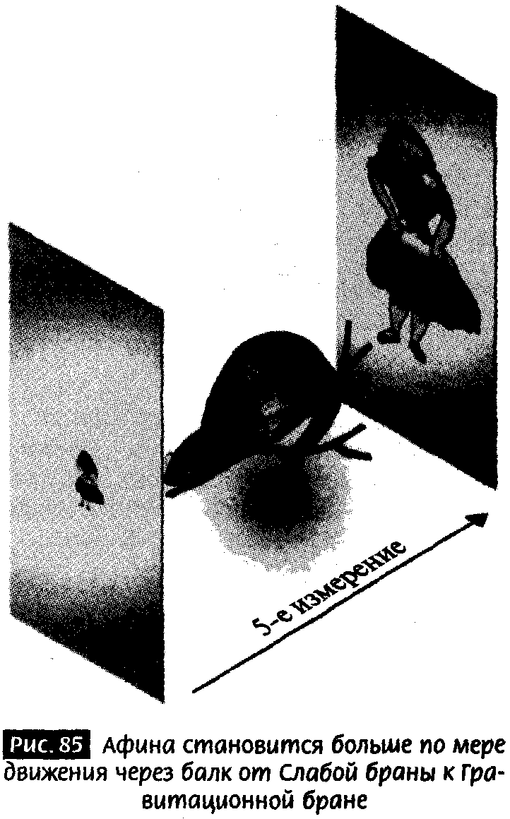 Какое странное оказалось пятимерное путешествие, покинув Брансвилл, Афина оказалась движущейся в другом измерении и растущей, как это уже с ней бывало (см. рис. 85).[167] Внимательный Кот заметил смущение на лице Афины и обнадеживающе объяснил: «Слабая брана уже близко, и мы там скоро будем[168]. Там красиво, но не волнуйтесь, когда вы увидите, что, как и жители Брансвилла, с которыми вы уже сталкивались, жители слабой браны издеваются над понятием четырех пространственных измерений, вы, имея возможность видеть через балк, увидите огромную тень над Брансвиллом, в десять миллионов миллиардов раз больше, чем та, с которой вы начинали. Почти все остальное будет казаться вам и им совершенно нормальным».