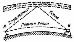 Примером может служить случай приема прямой и отраженной волн, что часто случается при приеме СВ. Эти волны способны огибать часть поверхности земного шара, если передатчик имеет достаточно большую мощность. На некотором расстоянии принимают одновременно прямую волну и волну, отраженную ионосферой. Пройденное ими расстояние неодинаково; отраженная волна проделала путь значительно больший, чем прямая (рис. 111).