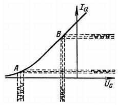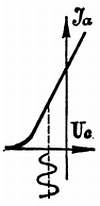 Как ты видишь, по мере того как отрицательный потенциал рабочей точки становится меньше, крутизна повышается. В точке В она выше, чем в точке А (рис. 113). Кривизна характеристики, однако, очень плавная, в результате чего небольшой участок этой кривой практически не отличается от отрезка прямой линии. Следовательно, колебания с малой амплитудой напряжения Uc не способны вызвать искажений анодного тока.
