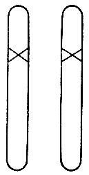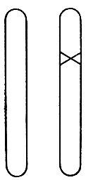 Мы должны были бы ожидать, что определенная мутация вызывается изменением в определенной области одной из хромосом. И так это и есть. Важно констатировать: мы твердо знаем, что это изменение происходит только в одной хромосоме и не возникает одновременно в соответствующем "локусе" гомологичной хромосомы. Схематически это показано на рис. 8, где крестом отмечен мутировавший локус.