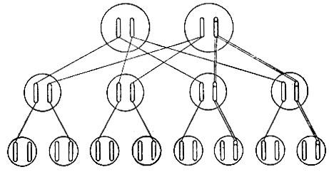 Рис. 9. Наследование мутации. Прямые линии указывают передачу нормальной хромосомы, а двойные - передачу мутировавшей хромосомы. Хромосомы третьего поколения, происхождение которых не указано, приходят невключенными в схему супругов особей второго поколения. Предполагается, что эти супруги не родственны и свободны от мутаций