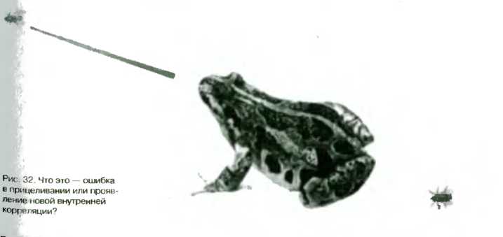 Этот эксперимент со всей наглядностью показывает, что для животного, в отличие от производящего экспе римент наблюдателя, не существует таких вещей, как «верх» и «низ», «спереди» и «сзади по отношению к внешнему миру. Существует лишь внутренняя корреляция между местом, где сетчатая оболочка испытывает данное возмущение, и сокращениями мышц, приводящих в движение язык, рот, шею, а фактически — все тело лягушки.