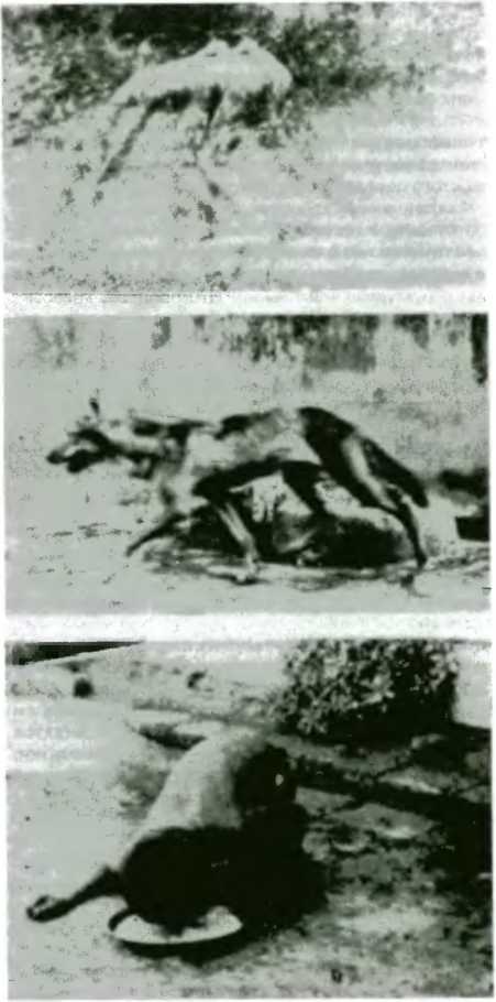 Рис 33. (а) и (в) Как видно из снимков, походка бенгальской девочки вскоре после того, как она была найдена, очень напоминала волчью, (с) Девочка-волк ест так, как она научилась, живя среди волков (d) Девочка так никогда и не стала чувствовать себя полноценным человеком признаков умственной отсталости или недоедания. Отрыв от волчьей семьи вызвал у девочек глубокую депрессию и привел их на грань смерти.