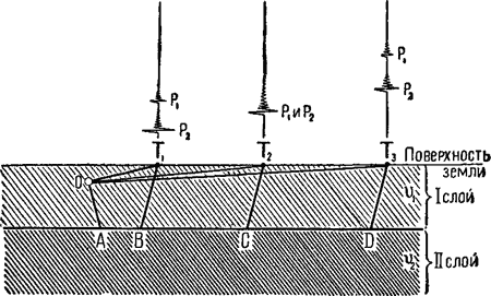 В точку T1, где, допустим, установлен первый сейсмограф, сначала придут волны Р1, следовавшие по прямому пути ОТ1, а затем волны Р2, которые шли по сложному пути ОАВТ1 с тем, что часть пути, именно АВ, они шли по нижнему слою, т. е. с большой скоростью (v2). Дальше от очага можно найти такой пункт Т2, в который и те и другие волны придут одновременно; путь ОТ2 короче, но зато на пути ОАСТ2 волны долгое время шли с большой скоростью (со скоростью v2 на пути АС). И, наконец, в точку Т3 сначала придут уже те волны Р2, которые шли по нижнему слою, по пути OADT3, а затем уже Р1, которые шли прямо, по пути ОT3; он короче, но скорость волн P1 здесь невелика (v1).