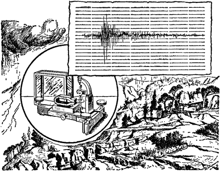 Представим себе, что где-то произошло сильное землетрясение. Очаг землетрясения, т. е. тот участок в толще Земли, в котором возникло землетрясение, располагается обычно на глубине нескольких десятков километров ниже поверхности Земли. Отсюда во все стороны разбегаются упругие волны, которые, дойдя до поверхности, и производят эффект землетрясения. Непосредственно над очагом эти упругие волны выражаются в сильных, резких, коротких ударах; вдали от очага они дают впечатление продолжительных волнообразных колебаний.