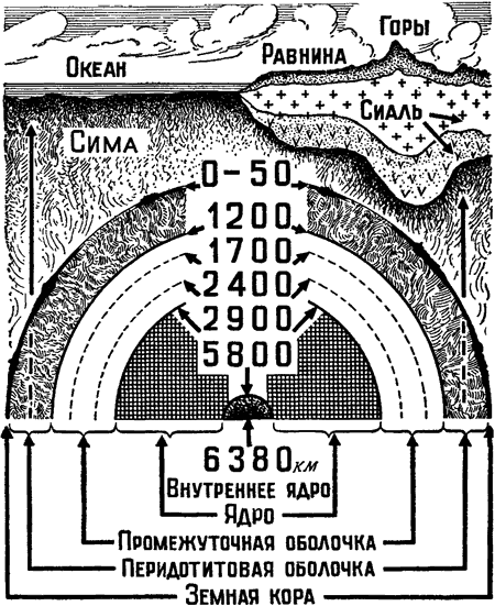 В последнее время появляются основания говорить о наличии еще нескольких поверхностей раздела (кроме уже упомянутых) на глубинах 900, 1800, 5800 км и др. Наличие подобных границ, или, по крайней мере, основных из них, таких, как подошва сиалической оболочки или граница ядра, сомнений не вызывает. Что же касается соображений о минералогическом составе оболочек и их агрегатном состоянии, то здесь, к сожалению, еще слишком много неясного. Прежде всего, нам мало известно, как изменяется внутри Земли температура и как влияет на свойства вещества одновременное воздействие высокой температуры и высокого давления.