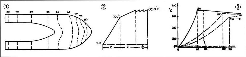 1. Схема распределения показателя твёрдости материала корпуса бронебойного снаряда. 2. Температурный график нагрева корпуса 16" снаряда перед закаливанием. 3. Температурные графики зонального отпуска корпуса 16" снаряда. (Иллюстрации из "Рапорта 0-19: Основные типы японских снарядов" Военно-морской технической миссии США в Японии, 1945.)