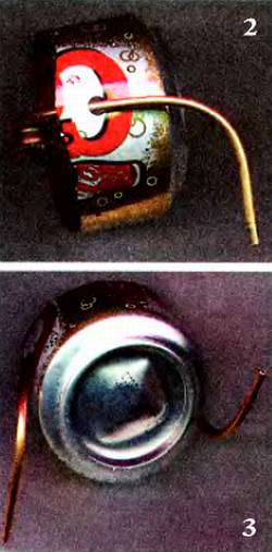 Пропустите через отверстия отрезок медной трубки диаметром примерно 2,5 мм. (Коли найдете трубку чуть большего диаметра, то и отверстия в стенках должны быть соответственно больше.) Изогните среднюю часть трубки в вертикальной плоскости так, чтобы сбоку она напоминала чайку, раскинувшую крылья в полете. Оставшиеся снаружи концы трубки длиной примерно по 5 см тоже изогните, но уже в горизонтальной плоскости. Один конец вправо, второй влево примерно под прямым углом (рис. 2, 3).