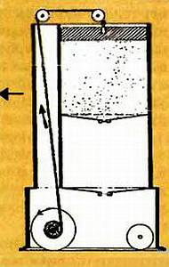 В качестве регулятора скорости использовался запас песка, который постепенно пересыпался из верхней части шкафа в нижнюю. Скорость опускания плиты регулировалась скоростью пересыпания песка, которая зависела от того, насколько широко раскрыты створки, отделявшие верхнюю часть шкафа от нижней.
