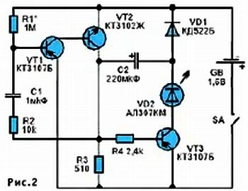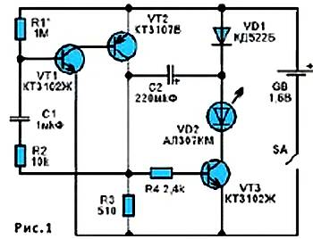 Генератор на транзисторах разной проводимости (p-n-p и n-p-n) типа КТ3107Б и КТ3102Ж вырабатывает низкочастотные импульсы, поступающие на светодиод. Частота следования импульсов составляет около 0,5–1 Гц и определяется элементами R1 и С1, а продолжительность вспышки — элементами R2 и С1. С выхода генератора (транзистор VT2) короткие импульсы через резистор R4 подаются на базу транзистора VT3, в коллекторную цепь которого включен светодиод HL1 красного цвета (АЛ307КМ) и диод VD1.