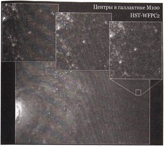 Рис. 21.10. Эдвин Хаббл нашел в Туманности Андромеды цефеиды и использовал их для определения расстояния. На этом фото показана примерно в 20 раз более далекая галактика М100, расстояние до которой было определено спустя 70 лет тем же способом. Тогда как обычная звезда на разных фото выглядит одинаково, переменная звезда со временем меняет свой блеск. Благодарность: HST. NASA, W. Freedman (CIW), R. Kennicutt (U. Arisona), J. Mould (ANU).